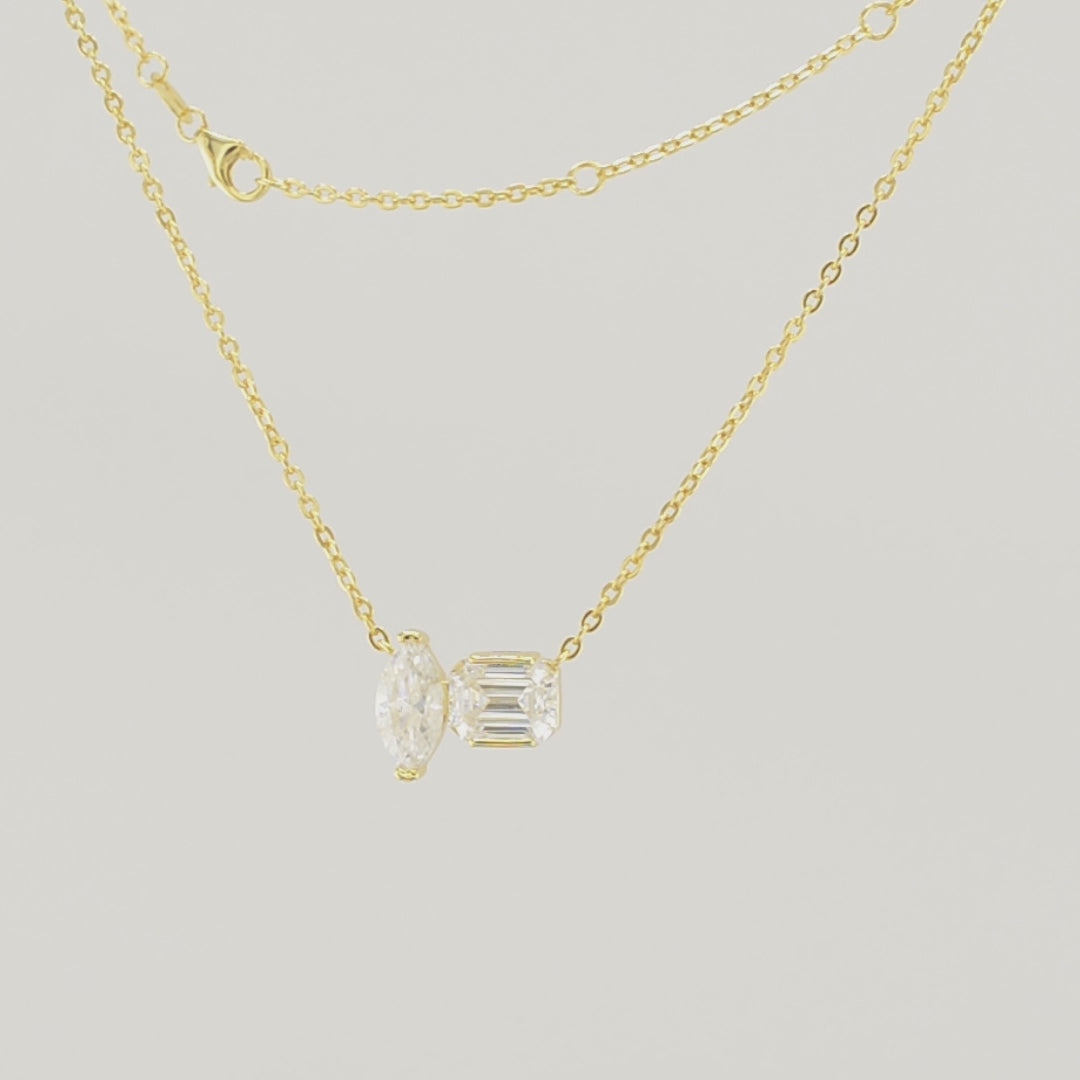 Two stones, two cuts, endless sparkle. This pendant necklace features a striking pairing of D-color VVS1 moissanite — a 1ct marquise (5×10mm) and a 2ct emerald cut (6×8mm) — set side by side in gold-plated sterling silver. The sleek contrast of shapes creates a modern yet timeless look, while moissanite’s brilliance rivals the finest diamonds.